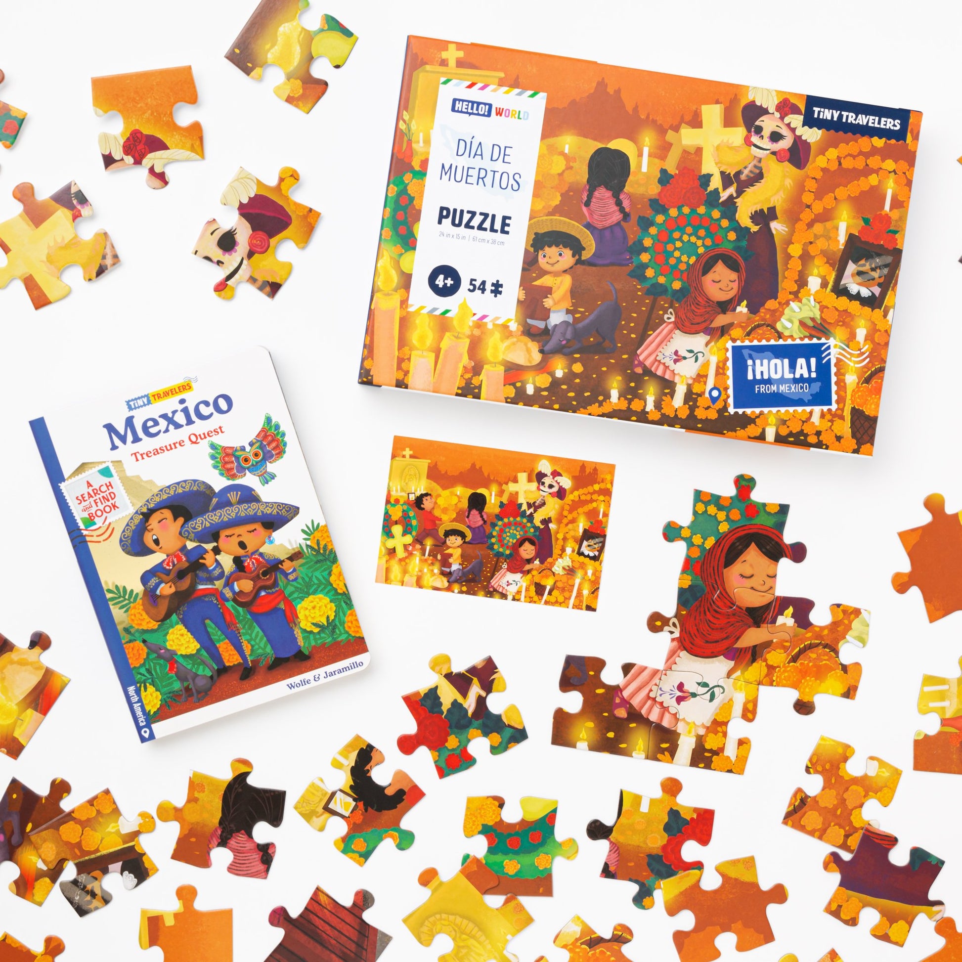 Includes 54-piece Día De Muertos puzzle and full color illustrated hard cover book.